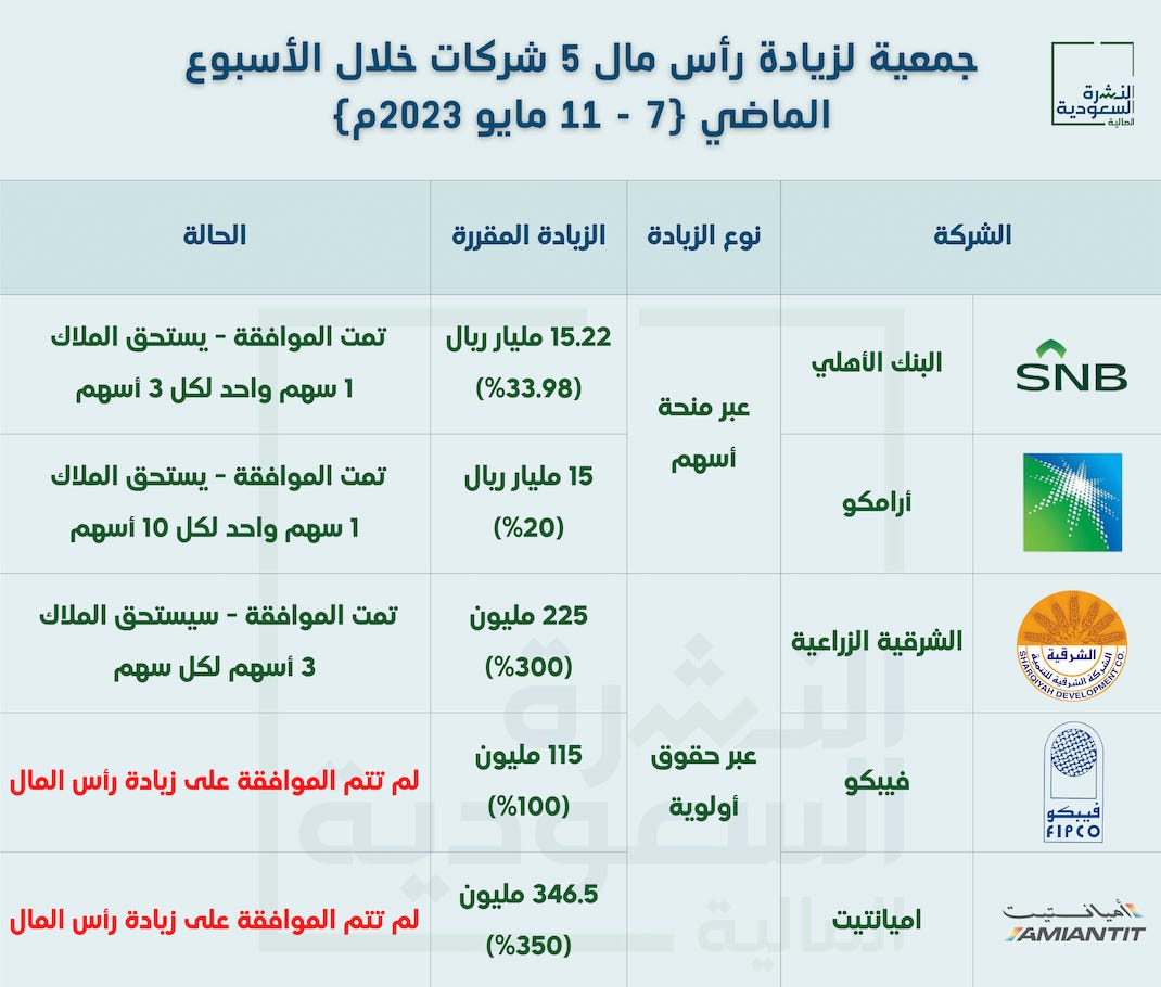 ورفع البنك الأهلي رأس ماله بمقدار 15.22 مليار ريال عبر منحة أسهم مجانية للمساهمين ، ورفعت أرامكو أيضا رأس مالها بمقدار 15 مليار ريال عبر منحة أسهم مجانية ، فيما زادت الشرقية الزراعية رأس مالها بمقدار 225 مليون عبر طرح أسهم حقوق أولوية.