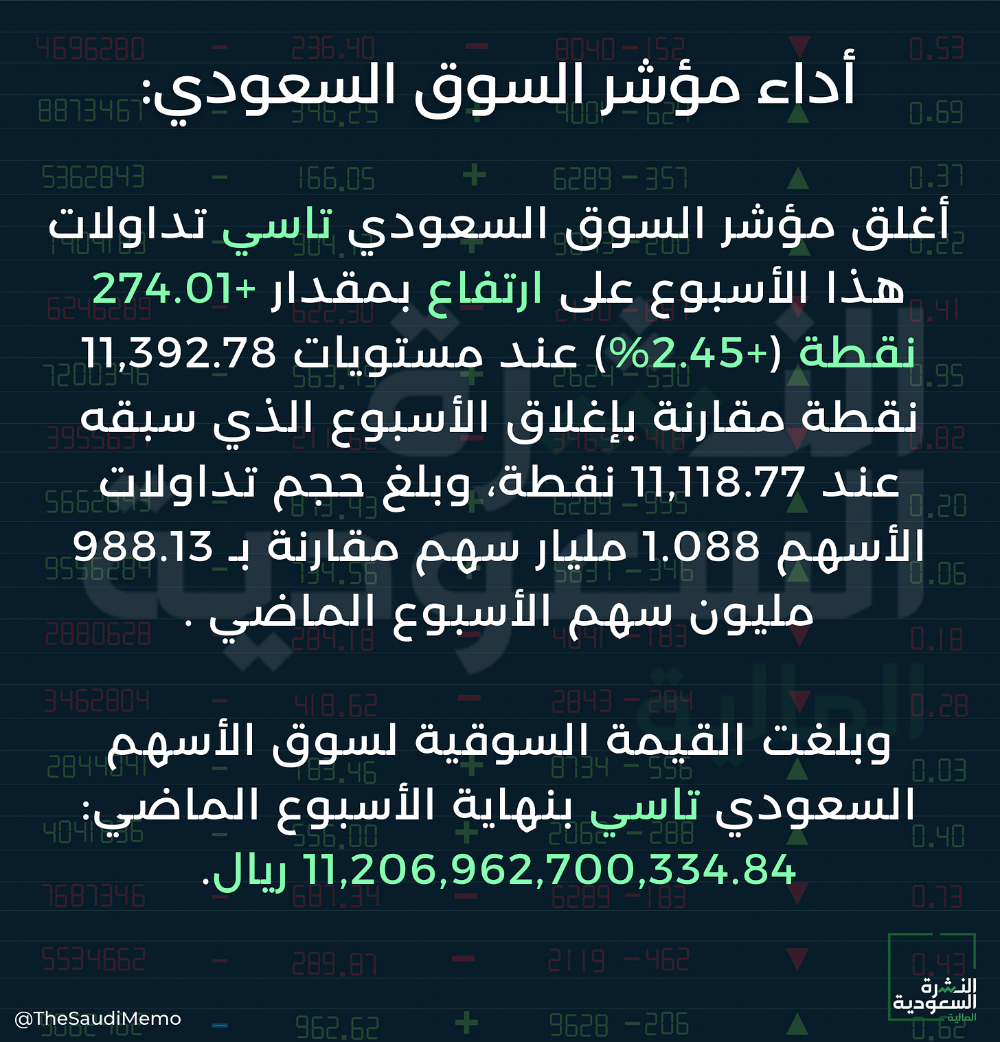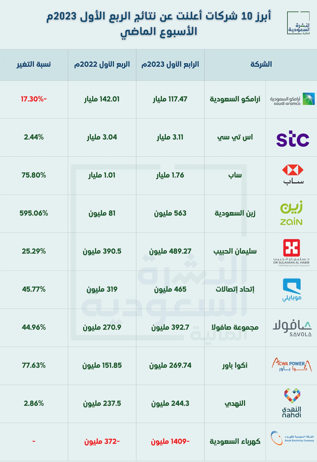 أعلنت الأسبوع الماضي 43 شركة عن نتائجها المالية للربع الأول 2023م ، حيث أعلن كل من: (أرامكو السعودية - اس تي سي - موبايلي - زين السعودية - كهرباء السعودية - بنك الأول ساب - البنك الفرنسي - التصنيع - بترو رابغ - اللجين - المتقدمة - البحري - الأصيل - التعمير - الجوف - الخريف - الصناعات الكهربائية - الغاز - المجموعة السعودية - المواساة - النهدي - أسلاك - اسمنت الشرقية - اسمنت العربية - أكوا باور - أنابيب - بوان - تكوين - حلواني إخوان - دور - زجاج - سابتكو - ساسكو - سلوشنز - سليمان الحبيب - شمس - فيبكو - كابلات الرياض - مجموعة صافولا - مسك - نماء للكيماويات - هرفي للأغذية - وقت اللياقة).