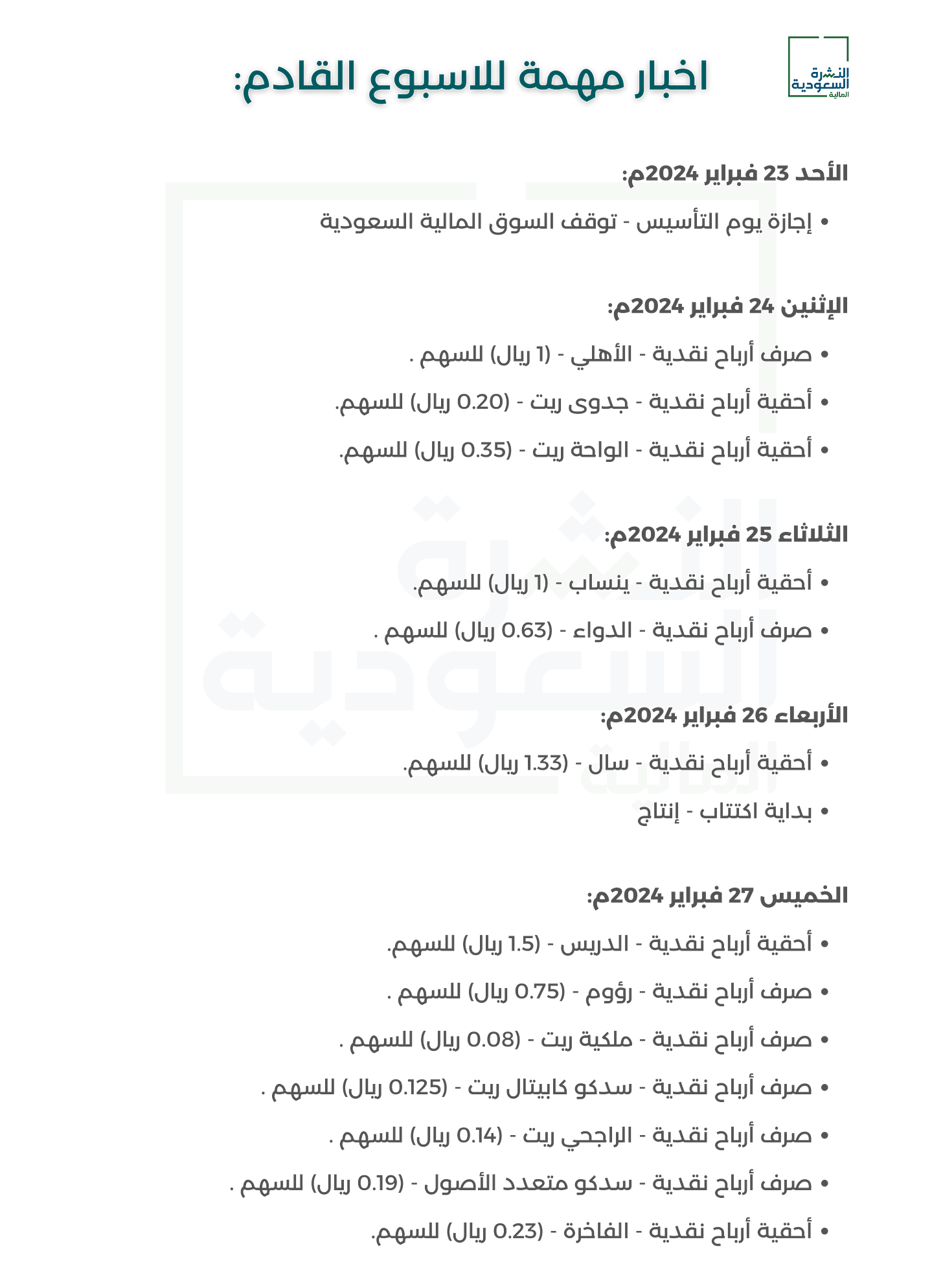 - توزيع 1.23 ريال للسهم الواحد عن الربع الرابع من العام 2024م.