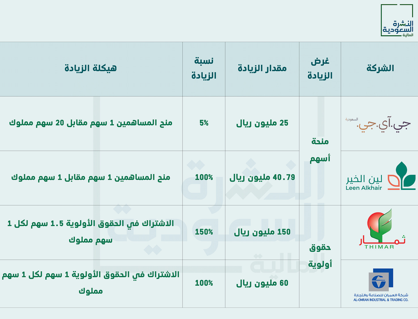 وكانت شركتي (جي آي جي للتأمين - لين الخير) قد أوصت في وقت سابق عن زيادة رأس مالها عن طريق منحة أسهم للمساهمين ، حيث يبلغ إجمالي الزيادة للشركتين مبلغ 65,79 مليون ريال عن طريق احتياطياتها والأرباح المبقاة.