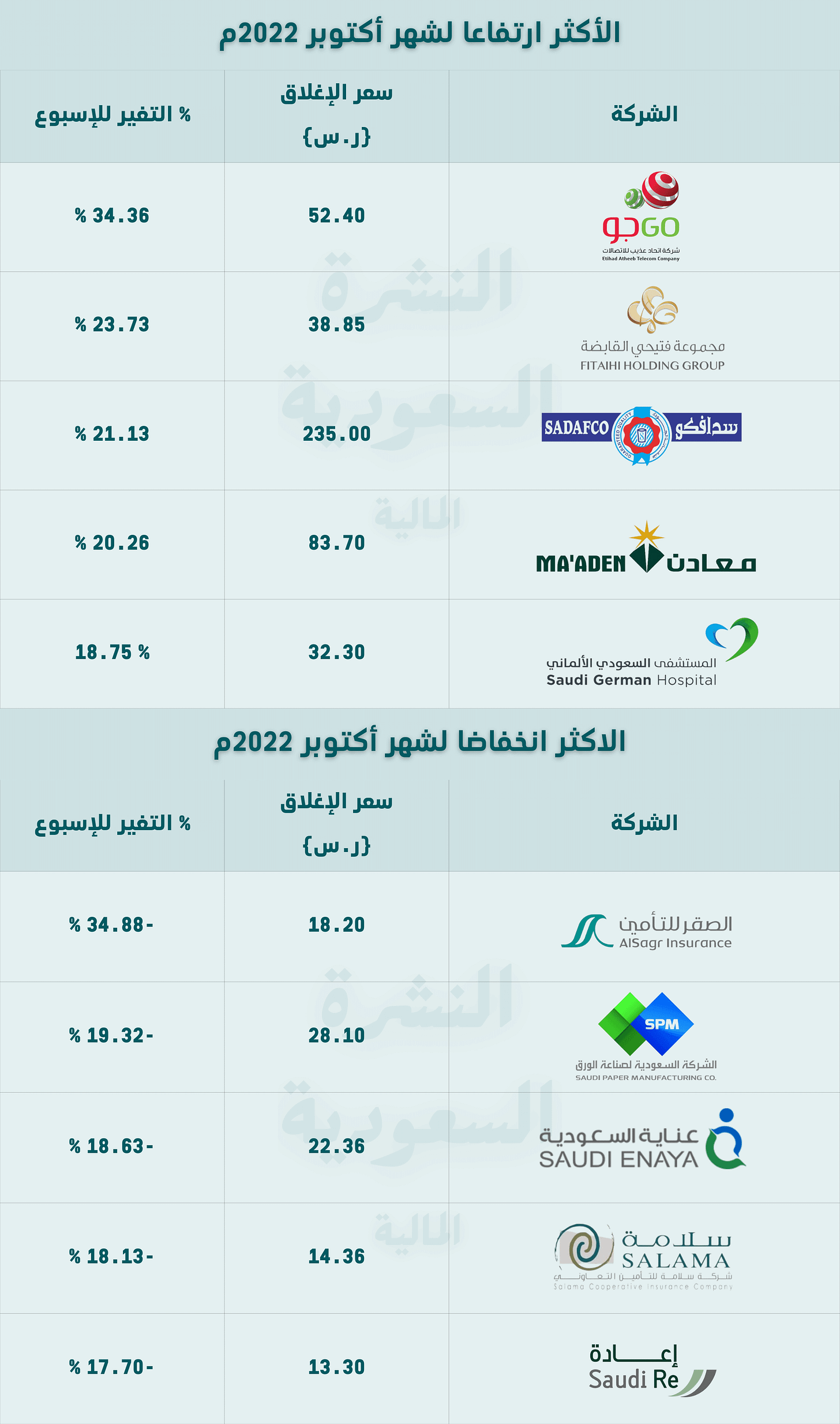 مرفقاً لكم الشركات الأعلى ارتفاعا وانخفاضا لشهر أكتوبر 2022م: