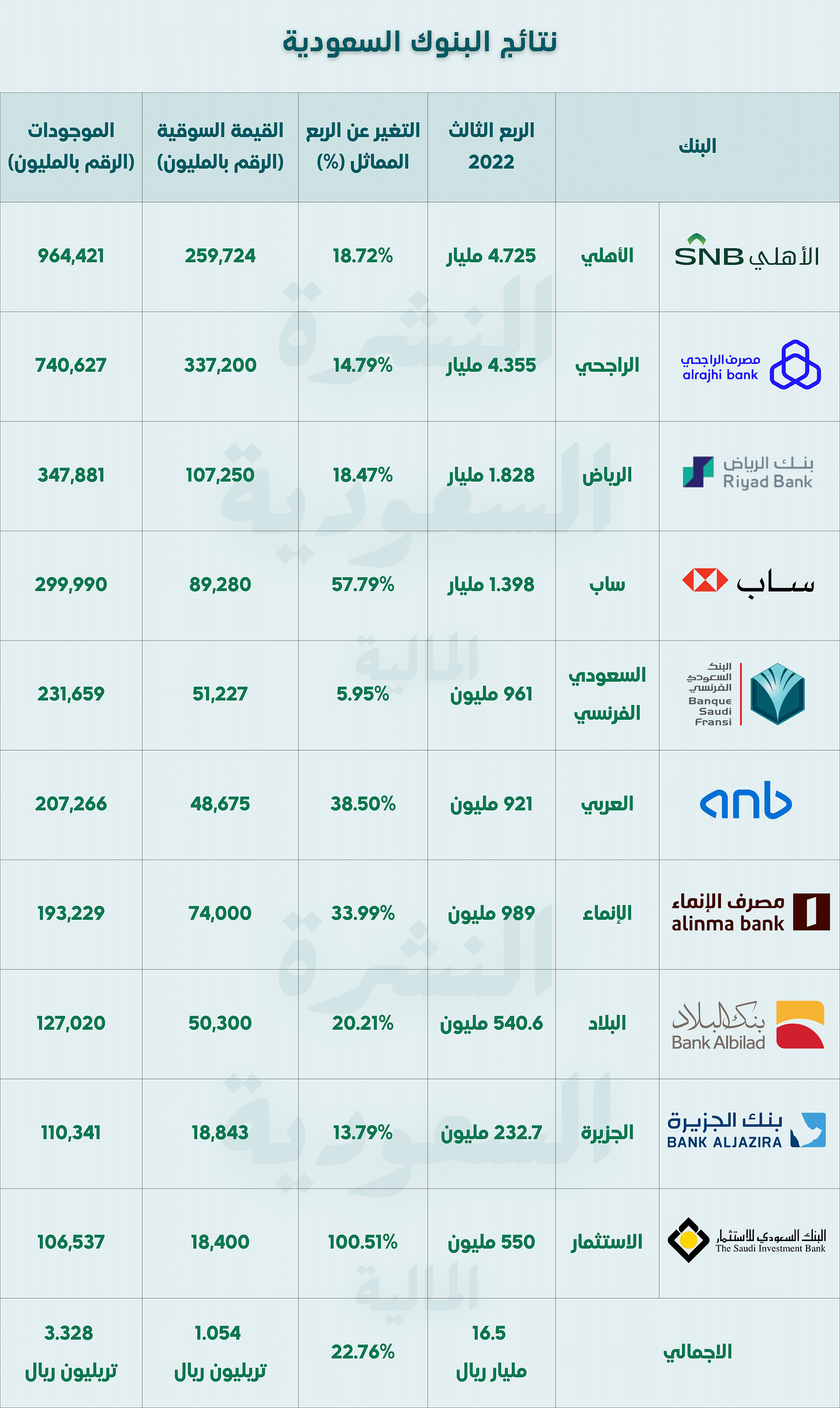 البنوك السعودية: نتائج الربع الثالث 2022م هي أعلى صافي أرباح بتاريخ البنوك للربع الثاني على التوالي